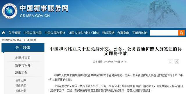 中新網6月6日電 據中國領事服務網消息,《中華人民共和國政府和岡比亞共和國政府關于互免持外交、公務、公務普通護照人員簽證的協定》將于2018年6月10日起正式生效。